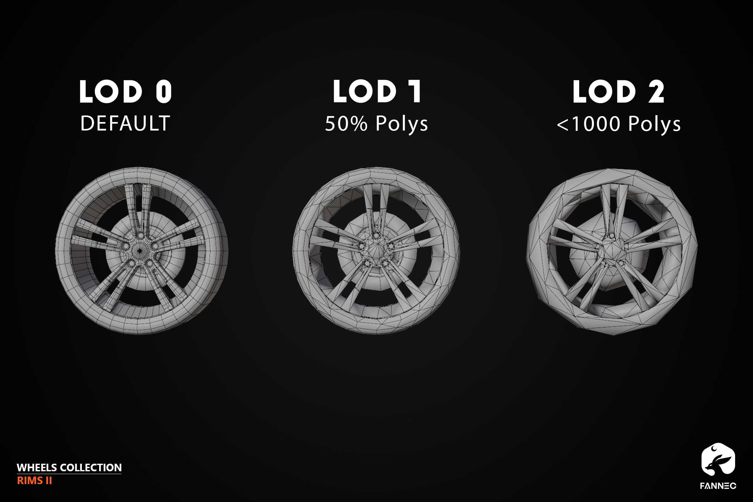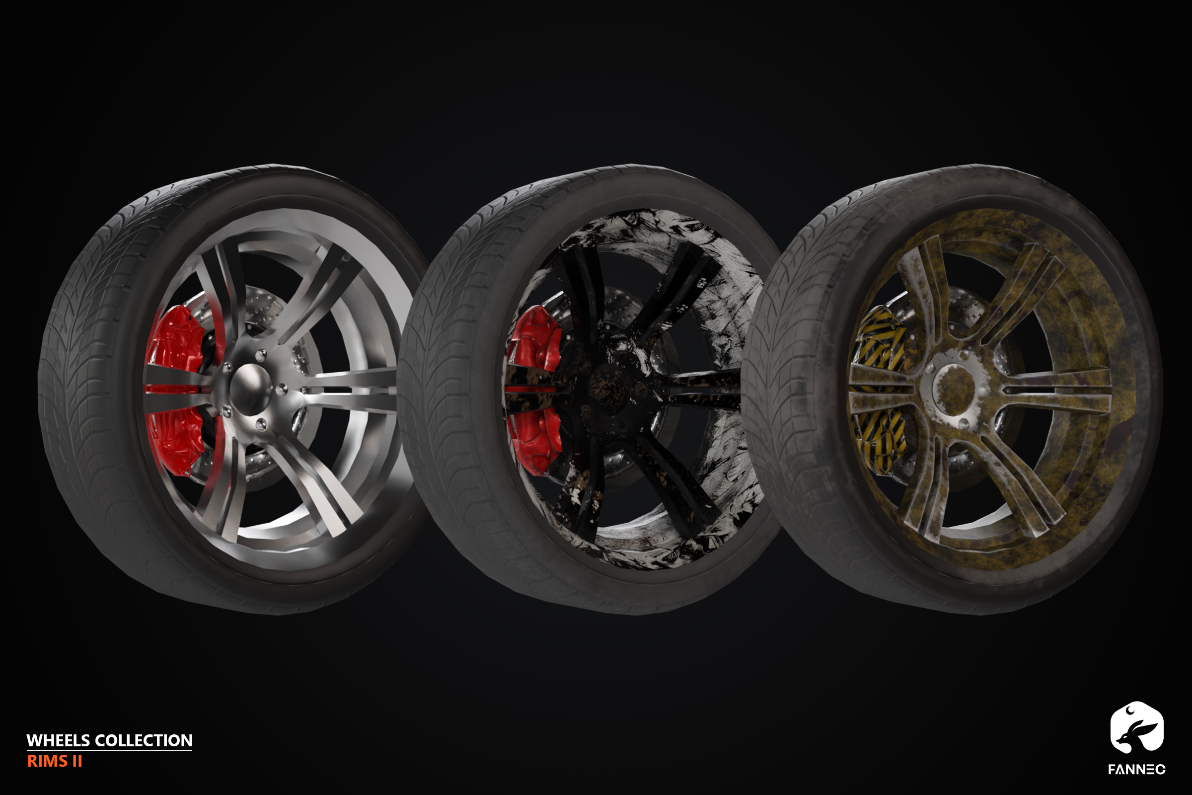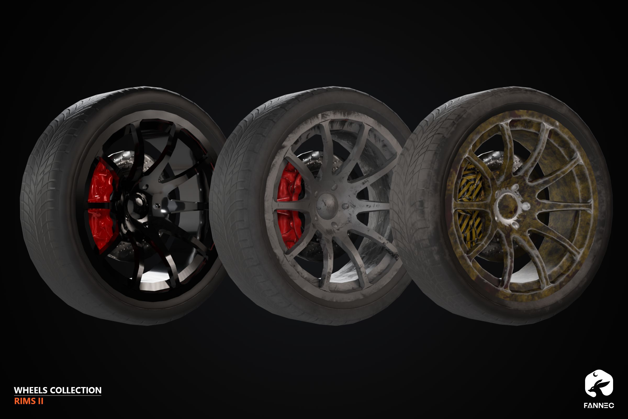 RIMS II - Wheels Collection is a set of unique modern wheel designs for land vehicles, each wheel comes in three different textures, depending on the condition (clean, dirty, very dirty). This package includes high-quality models, realistic textures, and a game-ready demo scene. All models have an LOD system to ensure smooth performance while maintaining the great appearance.